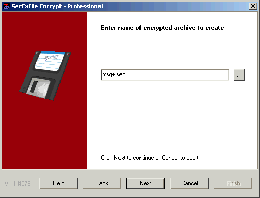 This screen lets you confirm or change the name of encrypted archive to be created. By default, SecExCipher files use the extension ".sec". When encrypting multiple files or folders, the name of the first item is chosen as the name of the encrypted archive and a plus sign is appended to the name. Click Next to continue.