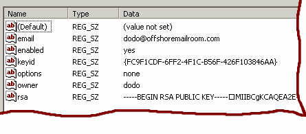 SecExMail keys held in the registry are stored in a format analogous to keys stored on file - with each parameter represented as a registry value. See image below.