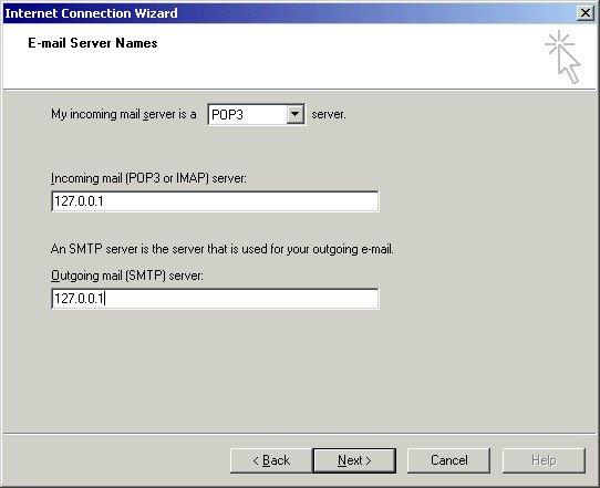 Enter the IP address 127.0.0.1 for both POP3 and SMTP servers. This IP address is the loopback address for all computers running the Internet Protocol and is located on your computer. SecExMail is listening on this IP address and will process all incoming and outgoing e-mail messages. Do not enter your internet service providers (ISP) mail server details here - see "Configuring your mail server". Click Next and the window shown below will appear.