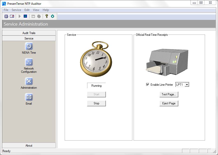 The service administration screen allows you to start and stop the PresenTense NTP Auditor service and configure the generation of official real-time receipts via a dedicated line printer.