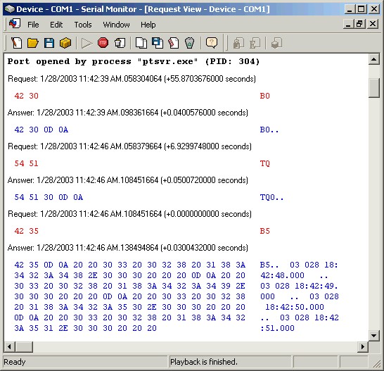 Additionally, we request that you submit a serial port capture, showing the interaction between PresenTense Time Server and your clock. This will confirm to us that your PC hardware is operating correctly and that your GPS or radio clock is properly connected to your PC. The serial port capture will also help us troubleshoot the interaction between your clock and PresenTense Time Server. We request that you submit your serial port capture as a ".lgs" file as produced by the HHD Serial Port Monitor. A sample serial port capture showing the interaction between PresenTense Time Server and an Arbiter GPS receiver is displayed below.